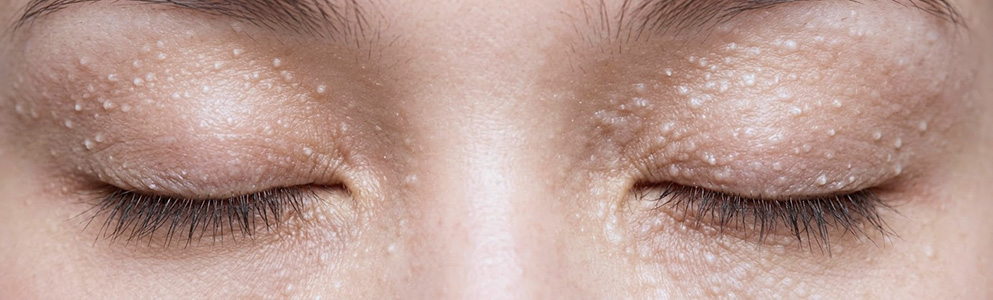好発部位は目の周り(特に目の下)で、イボ状にブツブツと盛り上がっています。