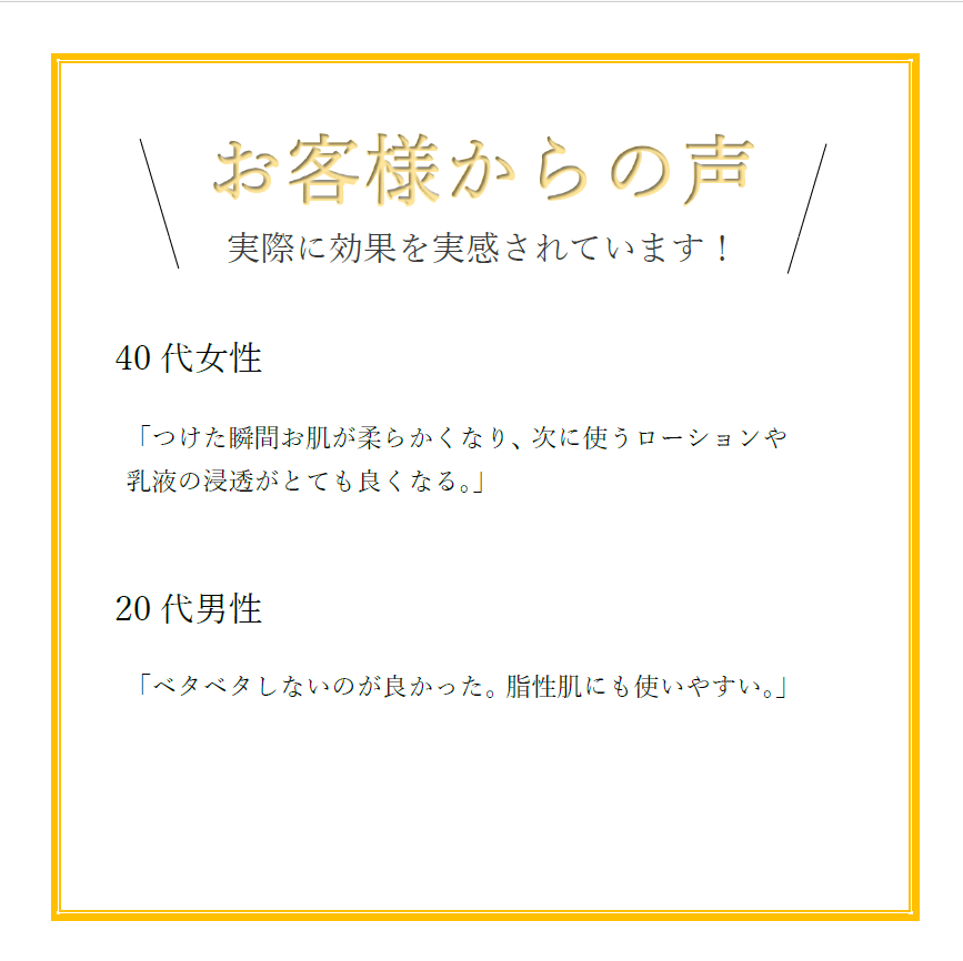「つけた瞬間お肌が柔らかくなり、次に使うローションや乳液の浸透がとても良くなる。」